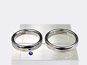 彼女の方には加えてサファイヤを留めます。 最初は、元デザインのように「裏に」というお話だったのですが、表に入れてワンポイントにした方が絶対よいと当方からご提案。 (やっぱり、見えないより見えた方がいいと思うんですよね。) 提案は正解だったと思います。 |